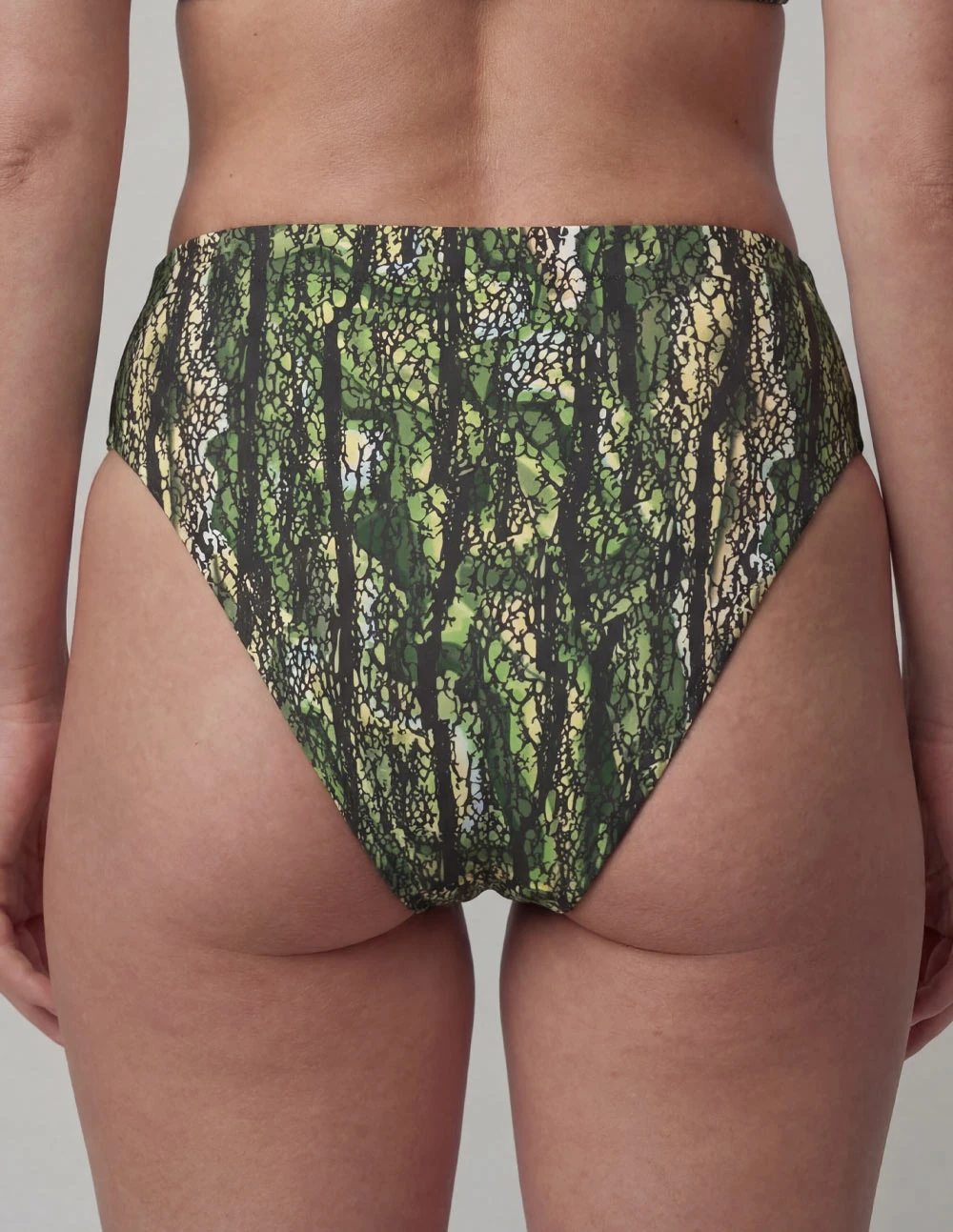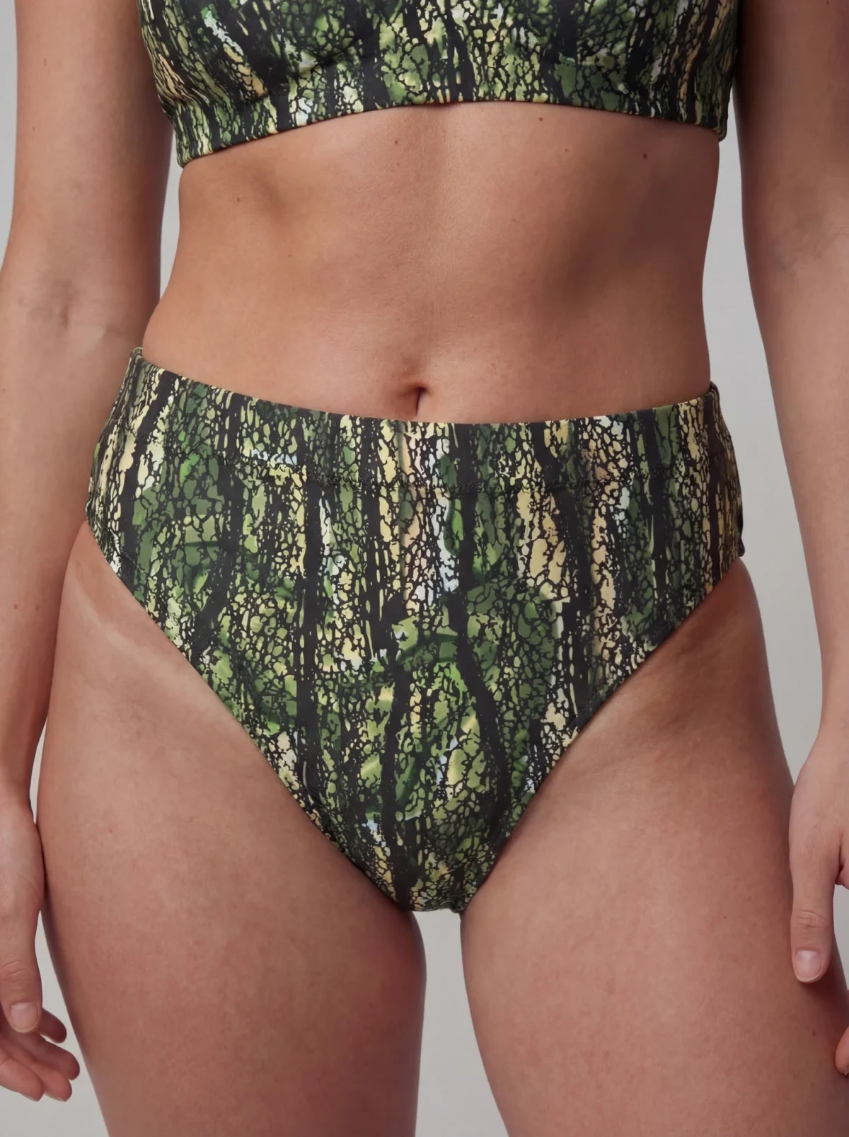 Crisp. Cellular. Organic. Derived from high-resolution photography of zucchini skin, this visual texture exposes the hidden green geometry of the harvest. The High Tide bikini bottom features a sculpting high-waist silhouette designed for core stability and coverage. The high-cut leg elongates the profile, creating the intersection of “Static” comfort and “Kinetic” performance. A seamless transition piece for the shoreline.