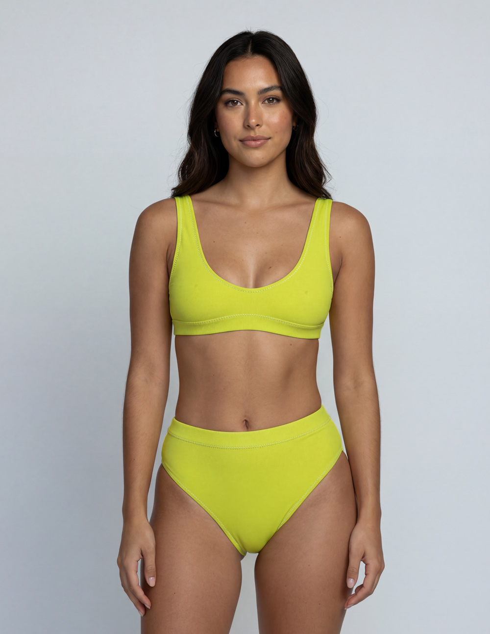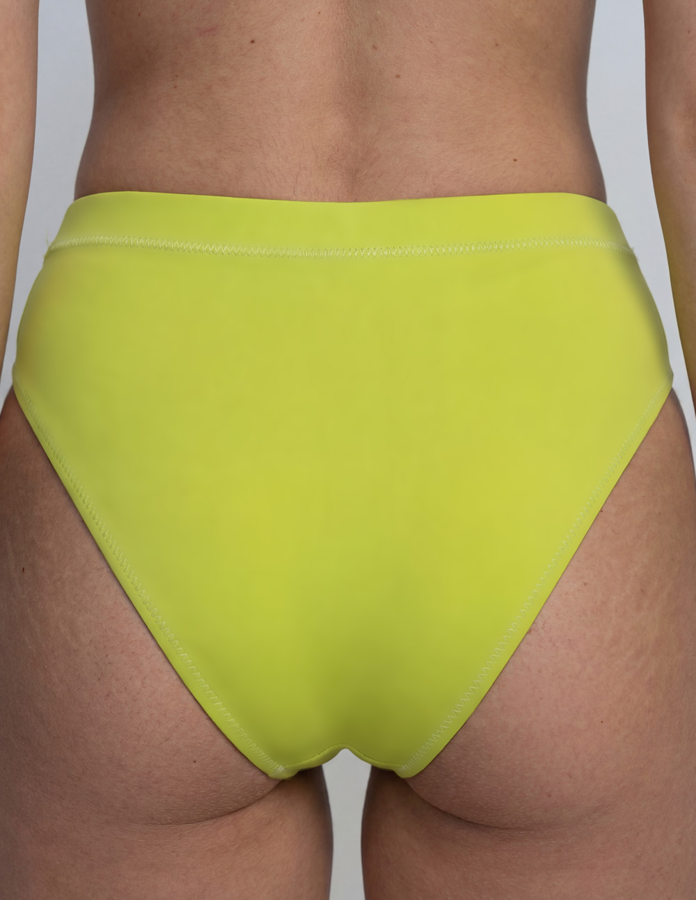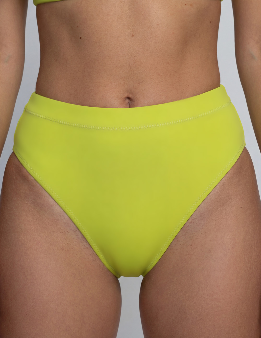 Dipped in Citron—our bio-digital lime green designed for high-visibility signaling. A high-output color for the active phase. The High Tide bottom features a sculpting high-waist silhouette designed for core stability and coverage. The high-cut leg elongates the profile, creating the intersection of “Static” comfort and “Kinetic” performance. A seamless transition piece for the shoreline. // 75% Recycled Poly, 25% Elastane