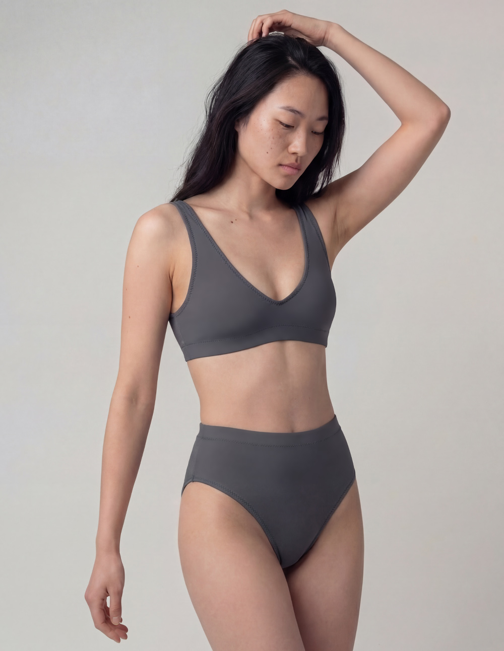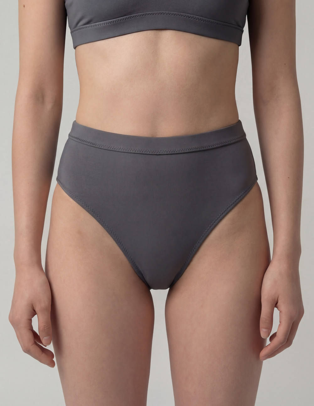Dark Elf is a deep, monolithic slate that disappears into the shade. For operations that require stealth. The High Tide bottom features a sculpting high-waist silhouette designed for core stability and coverage. The high-cut leg elongates the profile, creating the intersection of “Static” comfort and “Kinetic” performance. A seamless transition piece for the shoreline. // 75% Recycled Poly, 25% Elastane