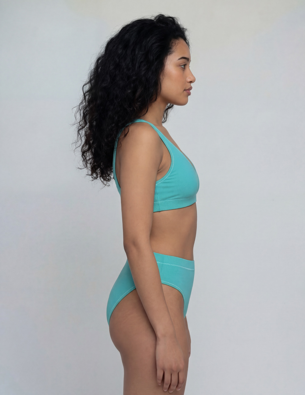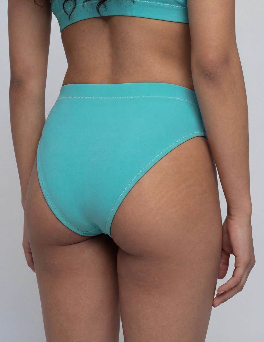 A surge of energy. Shockwave is a bio-luminescent teal that cuts through the noise. Engineered for maximum contrast against the urban environment. The High Tide bottom features a sculpting high-waist silhouette designed for core stability and coverage. The high-cut leg elongates the profile, creating the intersection of “Static” comfort and “Kinetic” performance. A seamless transition piece for the shoreline. // 75% Recycled Poly, 25% Elastane