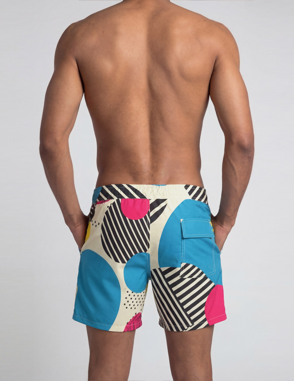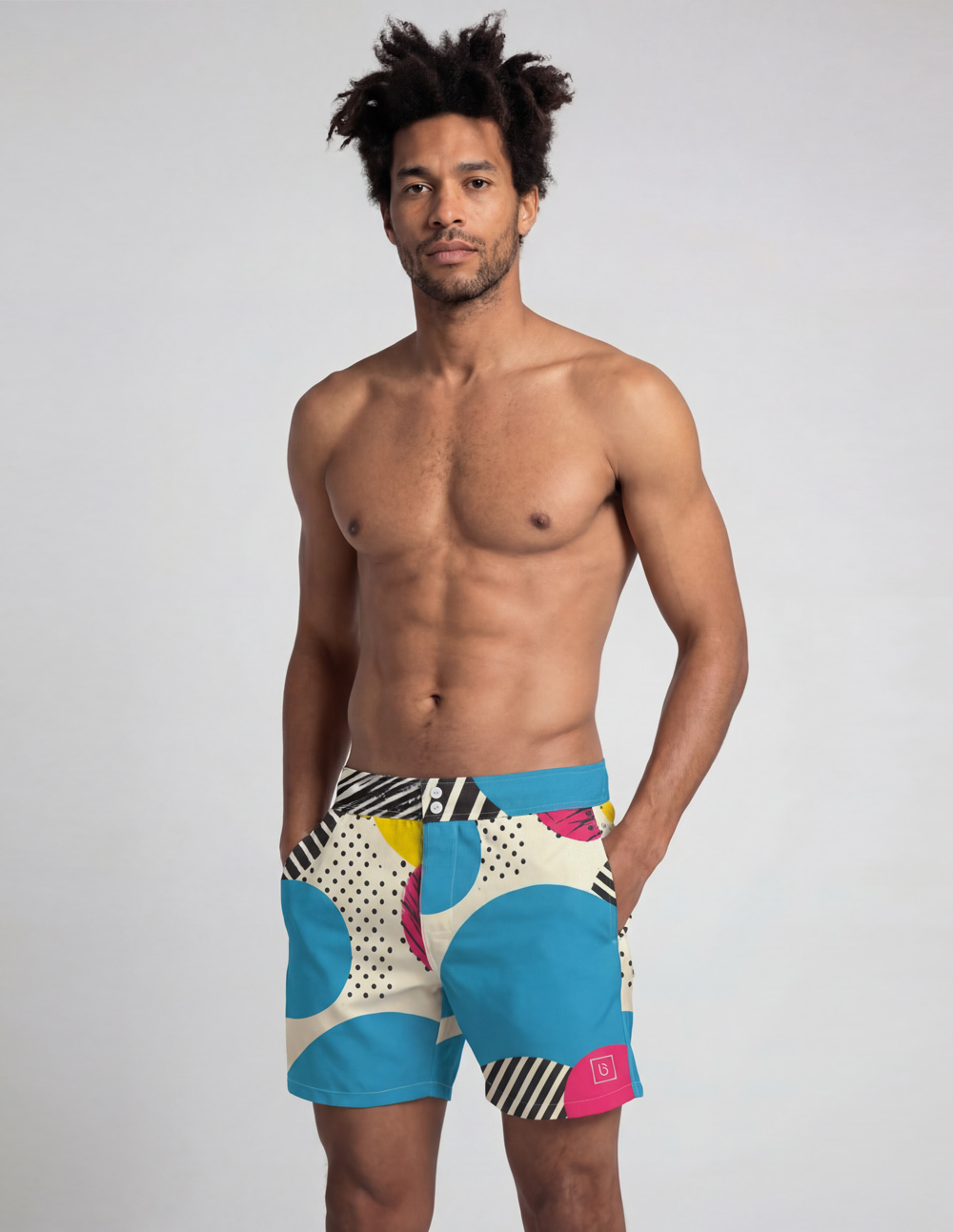 Bubble Yum features massive geometric circles and diagonal stripes in blue, yellow, and hot pink, reading like a deconstructed comic book. Designed for the guy who wants to be seen, this short combines pop-art aesthetics with serious open-water utility.