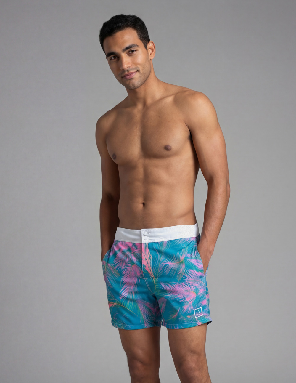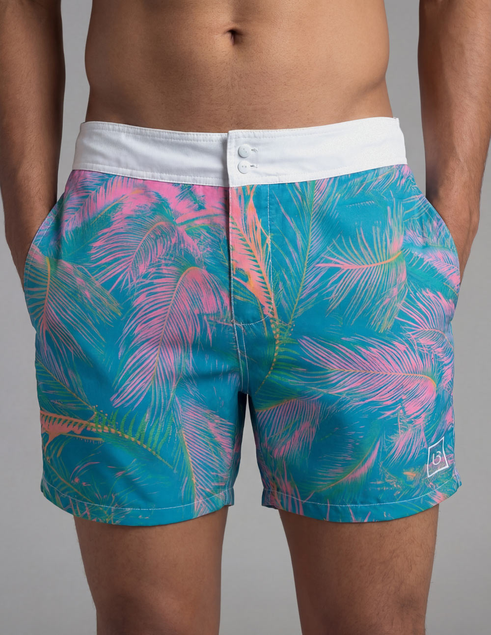 Electric. Saturated. Lucid. The Hybrid Short in Neon Breeze. We took the classic surf palm and ran it through a synth-wave filter.