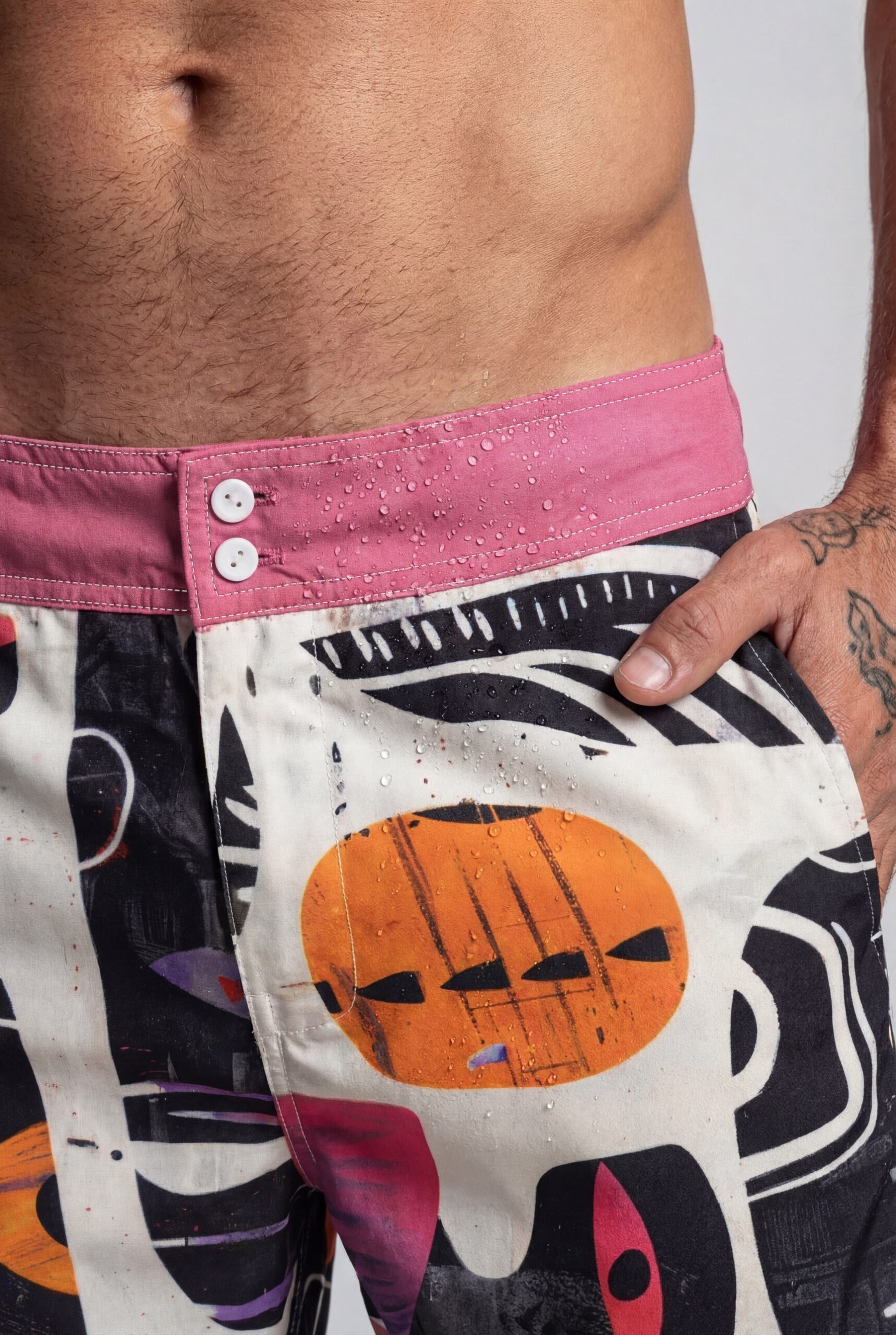 Relic channels the spiritual weight of neo-tribalism through the distorted lens of alien pop art. The print is a high-contrast excavation of stylized spirit-masks, ancient eyes, and kinetic geometry in black, white, ocher, and magenta. It is visual rhythm—a “future-primitive” object built for the migration from land to sea.