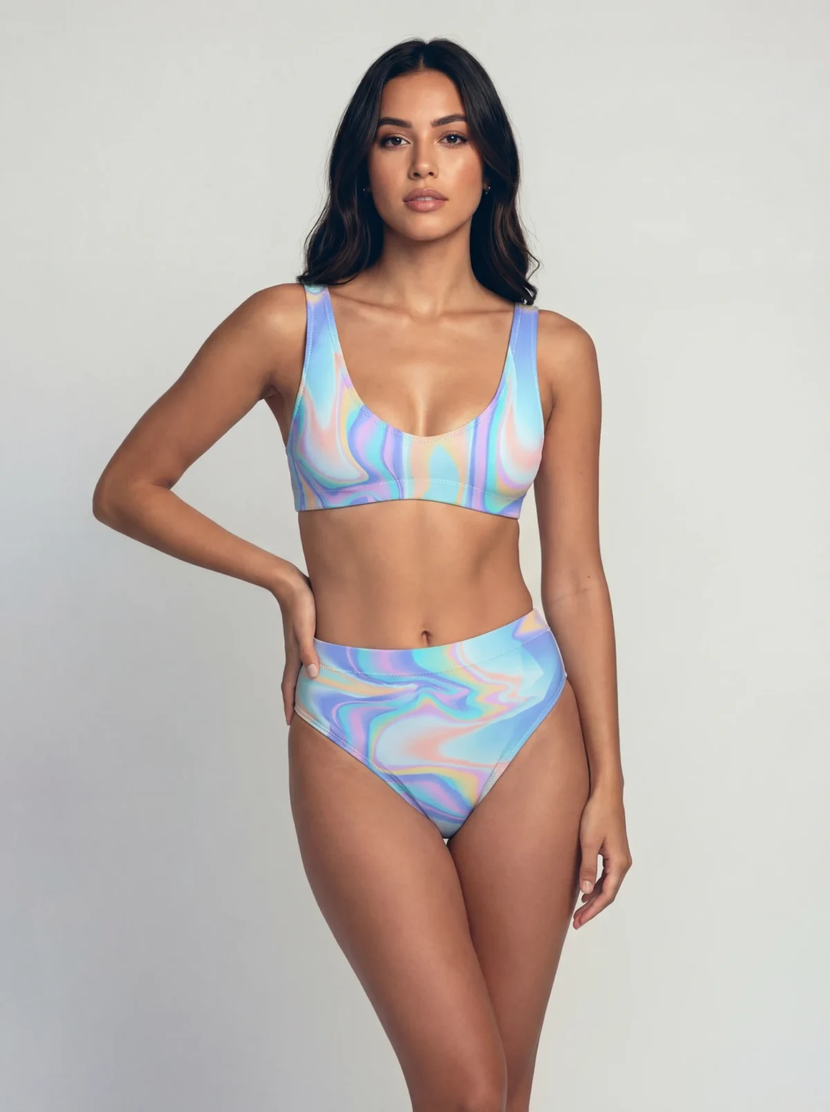 Fluid. Spectral. Industrial. A study in liquid dynamics. The Hydro-Dip colorway mimics the suspension of pigment on water, creating a distorted, spectral pattern that refuses to sit still. The Thruster bikini top bridges the gap between a surf top and a sports bra, featuring a scoop neck profile, removable cups and wide straps for maximum security in heavy water.