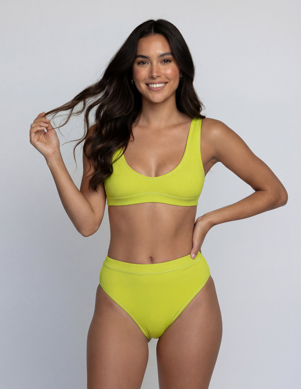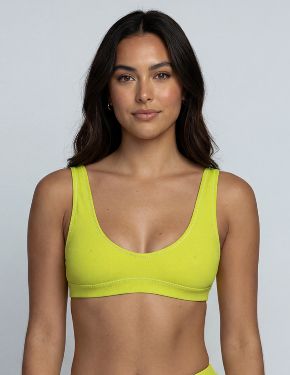 Dipped in Citron—our bio-digital lime green designed for high-visibility signaling. A high-output color for the active phase. The Thruster silhouette bridges the gap between a surf top and a sports bra, featuring a scoop neck profile, removable cups and wide straps for maximum security in heavy water.