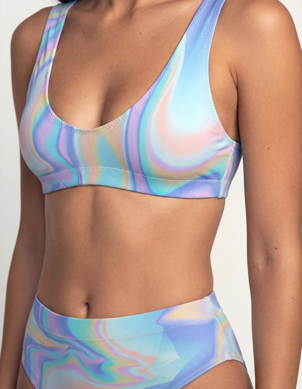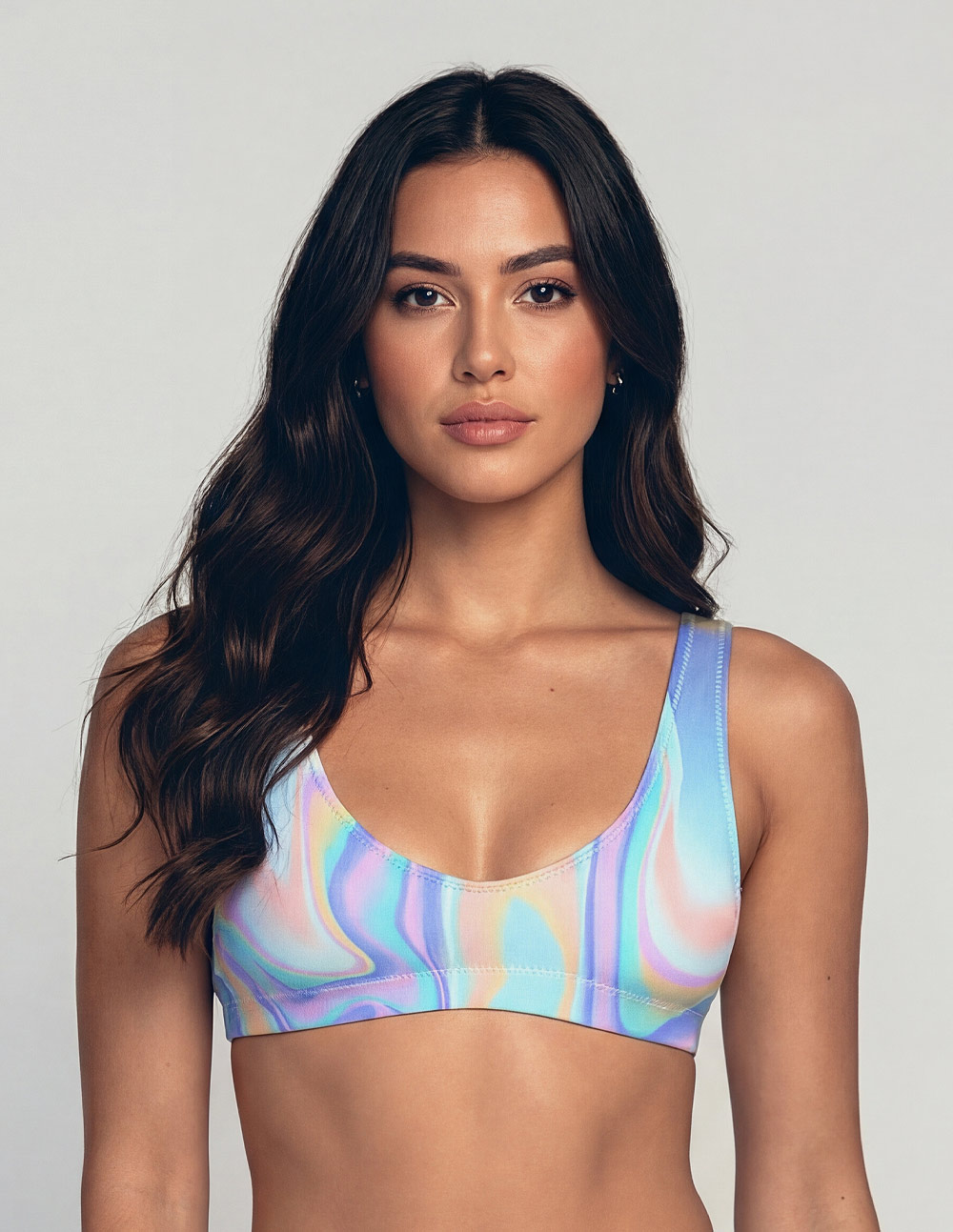 A study in liquid dynamics. The Hydro-Dip colorway mimics the suspension of pigment on water, creating a distorted, spectral pattern that refuses to sit still. The Thruster silhouette bridges the gap between a surf top and a sports bra, featuring a scoop neck profile, removable cups and wide straps for maximum security in heavy water.