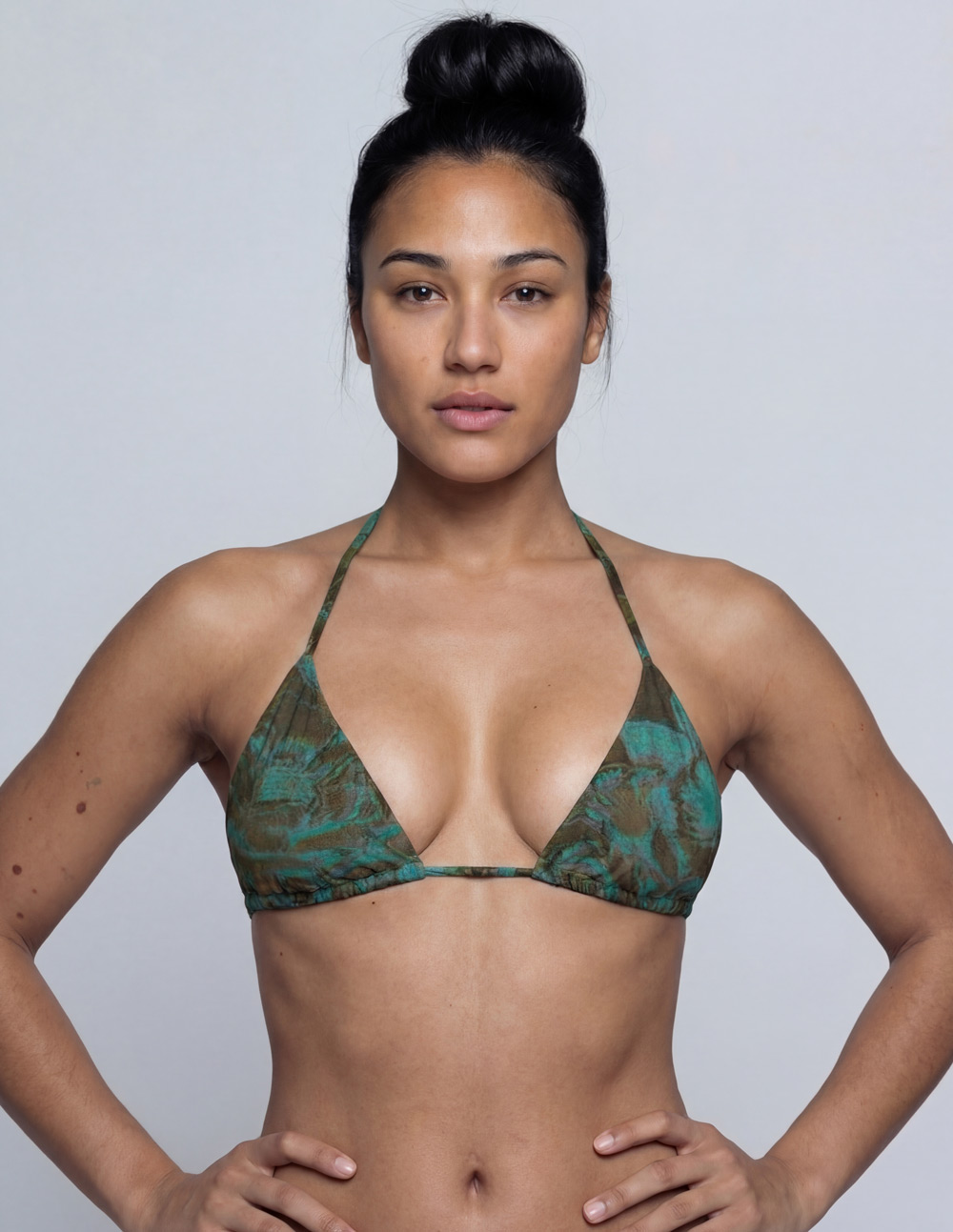 Distilled. Muted. Organic. A desaturated study of the classic bloom. The Herbal Brew pattern captures the geometry of rose petals, re-rendered in a low-light spectrum of oxidized teal and sediment brown. The Vertex bikini top is designed for the atmosphere rather than the break, this is a visual signal suited for the sun and the shoreline.
